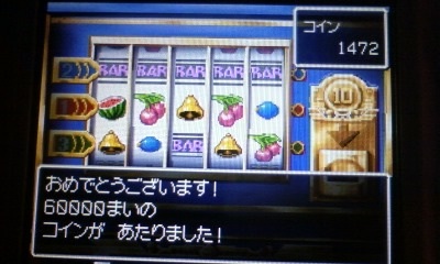で、なけなしのお金をメダルに変えてまずは10コインスロット。でも絵がそろわずメダルの量はあっという間に底をついたのでリセット。ふたたびスロット→破産→リセット。これを5回ほど繰り返していたらキタコレ!