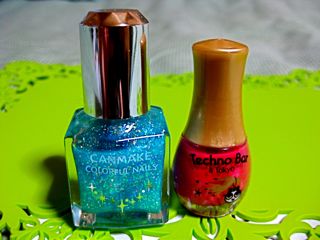 もう八月も終わりだというのに、夏っぽさを狙ってみました。ピンクの濃い色は手の指に使えないのでペディキュア用。仕事柄濃い色は、あまりよい顔をされないので。水色のラメ入りも全体に塗ると目立ちすぎるのでグラデーションに。