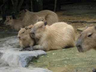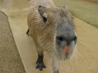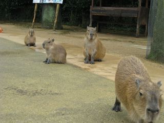 入るとすぐにカピバラが寄って来る。バイオパークは各所で動物のエサが売られているので、お客が自分でエサを与えられるのです。それが分かってるから、カピ達も「なんかもらえるかも」と期待するみたい。