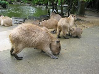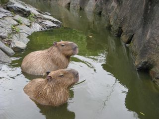 春にベビーが生まれたらしく、ちっこいのがウロウロしてました。これがまた、かわいいのよ。入り口の案内には「子カピはまだ人になれていないので、無理矢理さわったりだっこしないでね」と注意書きされていたけど、一番最初にまとわりついてきたのは子カピだった。ていうか子カピ団が「なんかくれよ」とマチカさんの服やカバンを噛みまくり。どう見てもマチカさんのほうが集団に襲われているようにしか見えない状態に。子カピは怖いもの知らずというか好奇心旺盛というか。