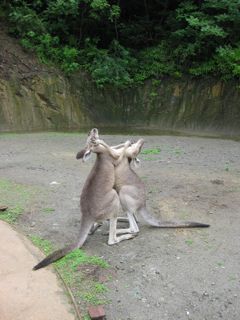 バイオパークはカンガルーエリアにも普通に入れちゃう。彼らの、このけだるい雰囲気はいったい何だ。だけどまったりムードの後ろで、小競り合いを繰り広げている2頭が。