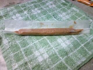 見た目がちょっとアレですね。これをスプーンでまぜまぜいたします。それからクッキングシートごと皿から上げて巻きますよ。