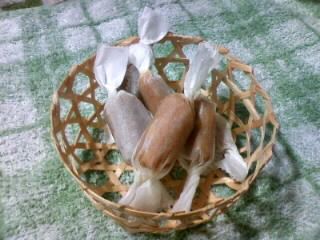 自分で食べるだけの場合、棒状の生キャラメルを切って口に入れたらよいのですが(もしくは男らしく食いちぎる)一応写真に撮るので体裁を整えてみました。それもクッキングシートをキャンディ仕様にして包んだだけなのがものぐさクオリティ。まあ、センス皆無なのでこんなもんでしょ。