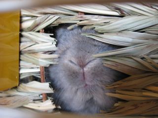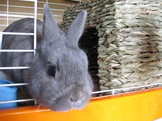 ↑うさぎの背後に干し草で編んだおうちがありますよね。このおうちは開口部が正面に見えている一部しかありません。それが気に入らないのか、リフォームして窓をこしらえてくれましたよ。